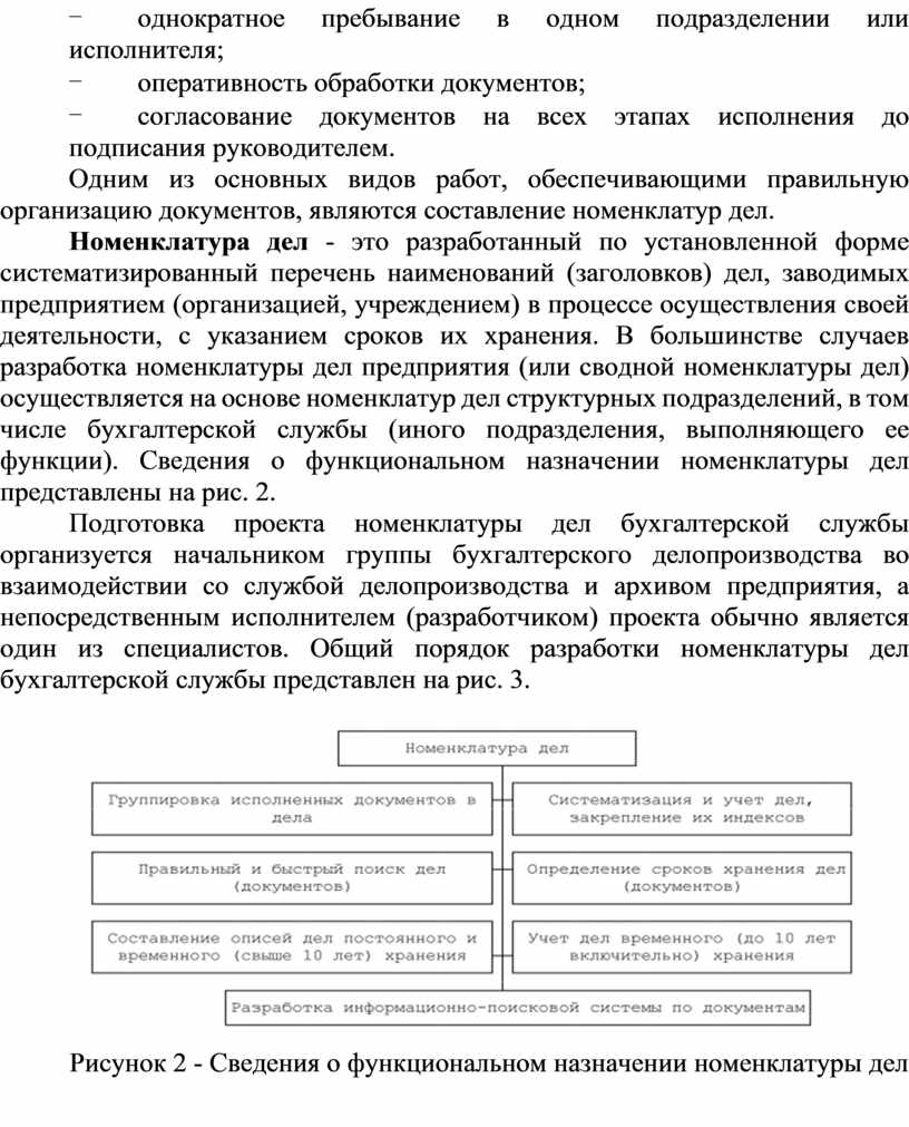 Номенклатура дел - это разработанный по установленной форме систематизированный перечень наименований (заголовков) дел, заводимых предприятием (организацией, учреждением) в процессе осуществления своей деятельности, с указанием сроков их хранения. В большинстве случаев разработка номенклатуры дел предприятия (или сводной номенклатуры дел) осуществляется на основе номенклатур дел структурных подразделений, в том числе бухгалтерской службы (иного подразделения, выполняющего ее функции). Сведения о функциональном назначении номенклатуры дел представлены на рис. 2.