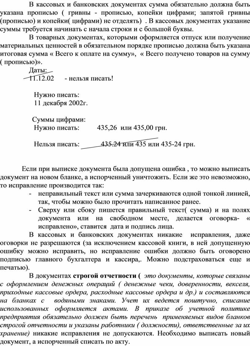 - неправильный текст или сумма зачеркиваются одной тонкой линией, так, чтобы можно было прочитать написанное ранее.