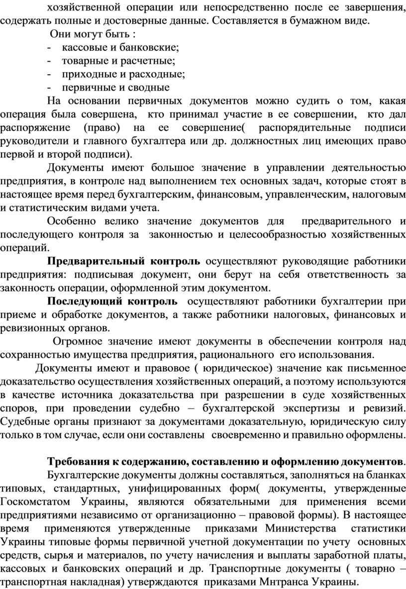 Особенно велико значение документов для предварительного и последующего контроля за законностью и целесообразностью хозяйственных операций.