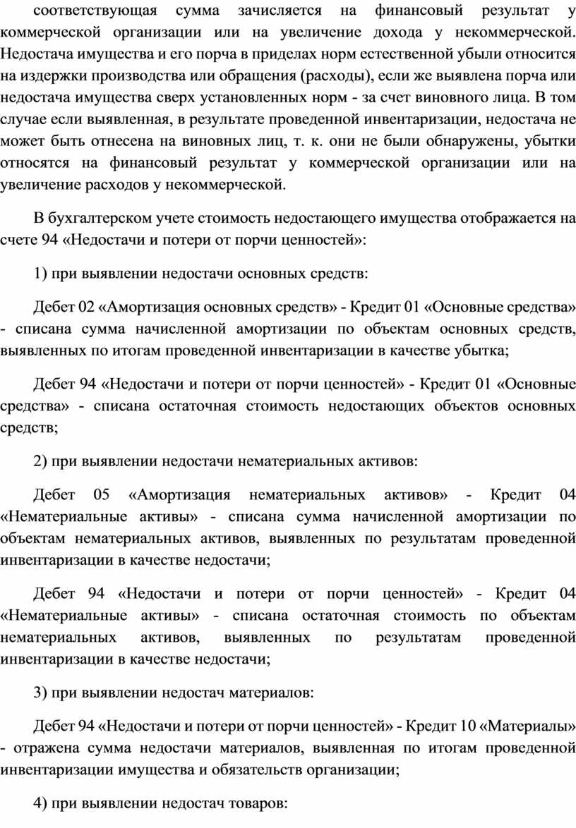 Дебет 94 «Недостачи и потери от порчи ценностей» - Кредит 10 «Материалы» - отражена сумма недостачи материалов, выявленная по итогам проведенной инвентаризации имущества и обязательств организации;