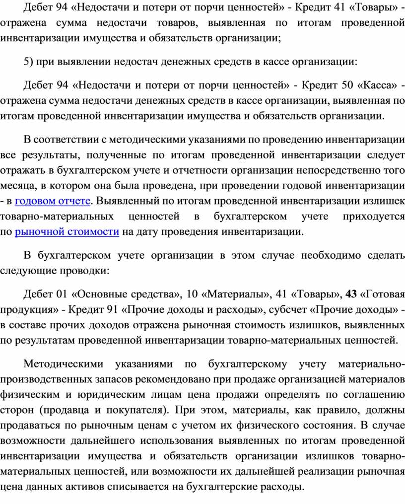 Дебет 94 «Недостачи и потери от порчи ценностей» - Кредит 41 «Товары» - отражена сумма недостачи товаров, выявленная по итогам проведенной инвентаризации имущества и обязательств организации;