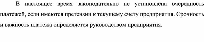 В настоящее время законодательно не установлена очередность платежей, если имеются претензии к текущему счету предприятия. Срочность и важность платежа определяется руководством предприятия.