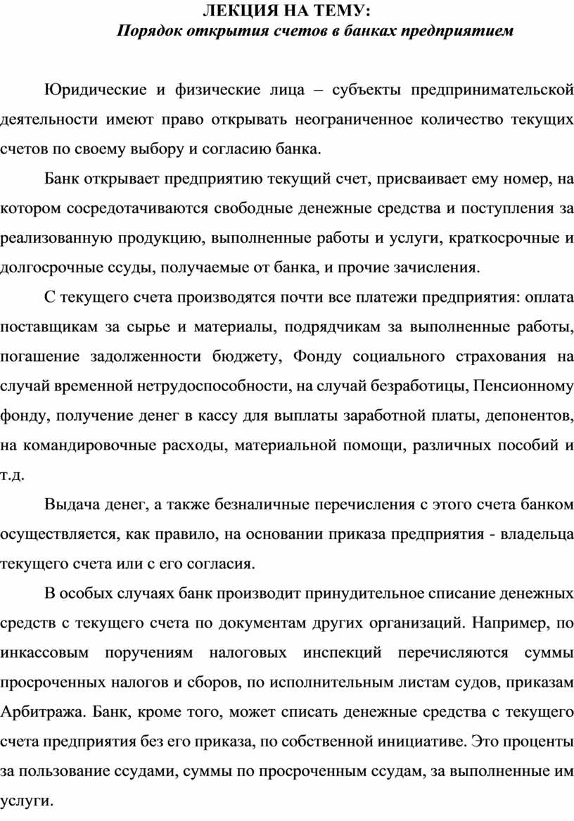 Банк открывает предприятию текущий счет, присваивает ему номер, на котором сосредотачиваются свободные денежные средства и поступления за реализованную продукцию, выполненные работы и услуги, краткосрочные и долгосрочные ссуды, получаемые от банка, и прочие зачисления.