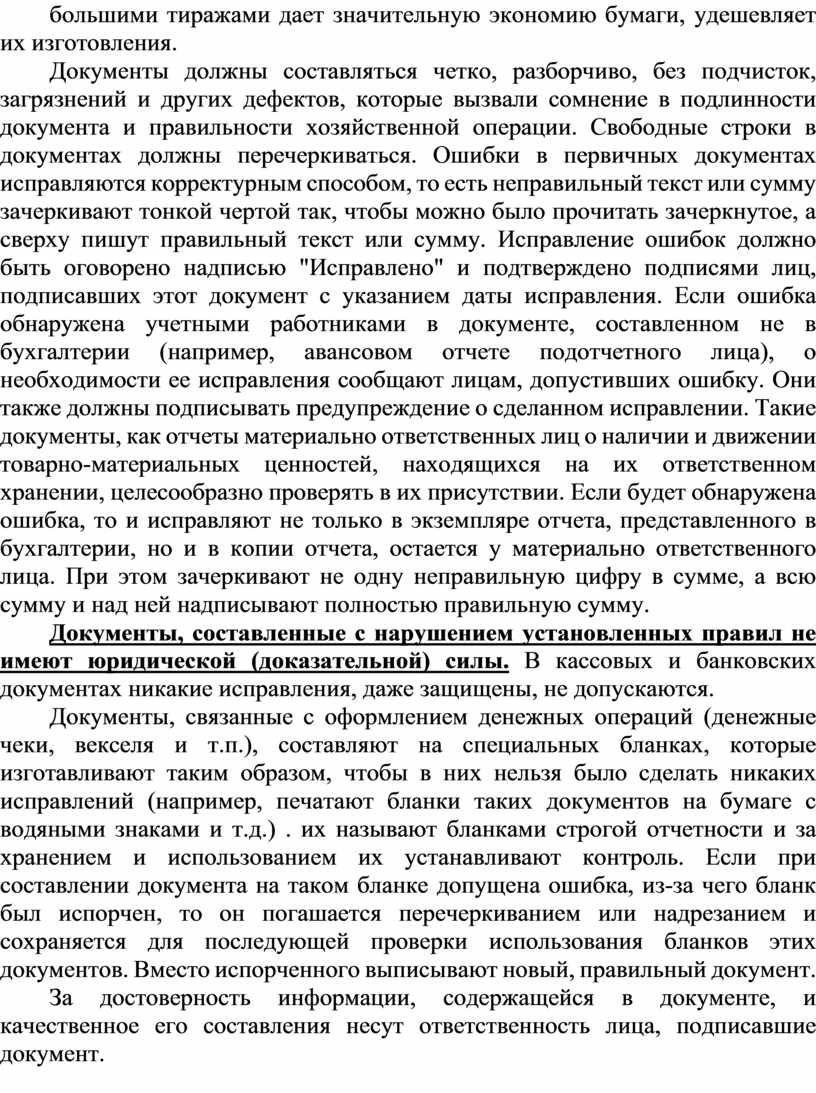 Документы должны составляться четко, разборчиво, без подчисток, загрязнений и других дефектов, которые вызвали сомнение в подлинности документа и правильности хозяйственной операции. Свободные строки в документах должны перечеркиваться. Ошибки в первичных документах исправляются корректурным способом, то есть неправильный текст или сумму зачеркивают тонкой чертой так, чтобы можно было прочитать зачеркнутое, а сверху пишут правильный текст или сумму. Исправление ошибок должно быть оговорено надписью "Исправлено" и подтверждено подписями лиц, подписавших этот документ с указанием даты исправления. Если ошибка обнаружена учетными работниками в документе, составленном не в бухгалтерии (например, авансовом отчете подотчетного лица), о необходимости ее исправления сообщают лицам, допустивших ошибку. Они также должны подписывать предупреждение о сделанном исправлении. Такие документы, как отчеты материально ответственных лиц о наличии и движении товарно-материальных ценностей, находящихся на их ответственном хранении, целесообразно проверять в их присутствии. Если будет обнаружена ошибка, то и исправляют не только в экземпляре отчета, представленного в бухгалтерии, но и в копии отчета, остается у материально ответственного лица. При этом зачеркивают не одну неправильную цифру в сумме, а всю сумму и над ней надписывают полностью правильную сумму.