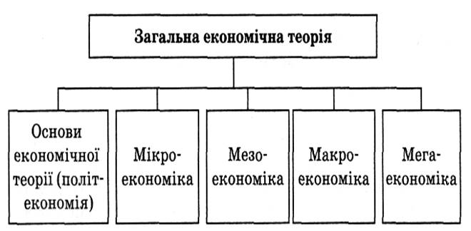 Економічна теорія в широкому розумінні включає такі розділи: основи економічної теорії (політекономія), мікроекономіка, мезоекономіка, макроекономіка, мегаеконотіка (рис. 3).