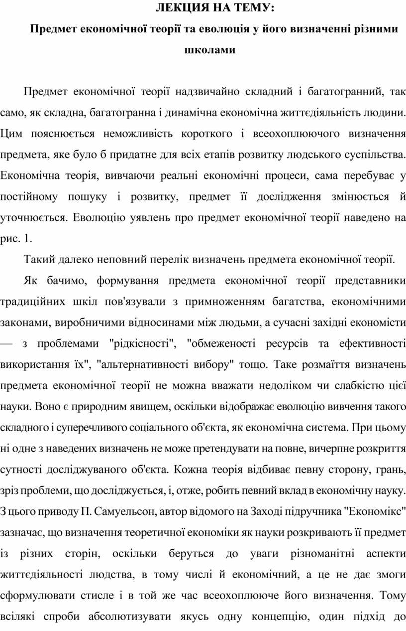 Предмет економічної теорії надзвичайно складний і багатогранний, так само, як складна, багатогранна і динамічна економічна життєдіяльність людини. Цим пояснюється неможливість короткого і всеохоплюючого визначення предмета, яке було б придатне для всіх етапів розвитку людського суспільства. Економічна теорія, вивчаючи реальні економічні процеси, сама перебуває у постійному пошуку і розвитку, предмет її дослідження змінюється й уточнюється. Еволюцію уявлень про предмет економічної теорії наведено на рис. 1.