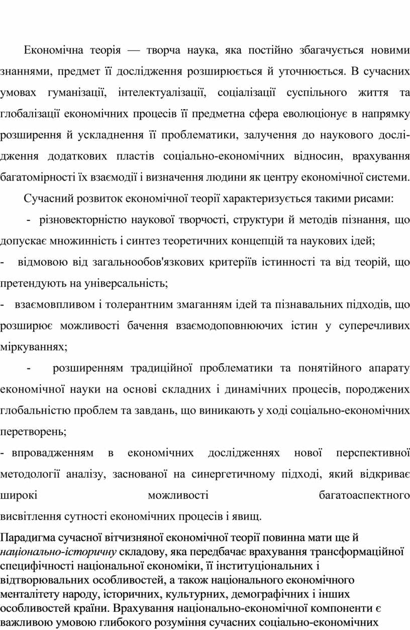 Парадигма сучасної вітчизняної економічної теорії повинна мати ще й національно-історичну складову, яка передбачає врахування трансформаційної специфічності національної економіки, її інституціональних і відтворювальних особливостей, а також національного економічного менталітету народу, історичних, культурних, демографічних і інших особливостей країни. Врахування національно-економічної компоненти є важливою умовою глибокого розуміння сучасних соціально-економічних процесів, які відбуваються в країні, і наукового прогнозування тенденцій їх розвитку в перспективі.