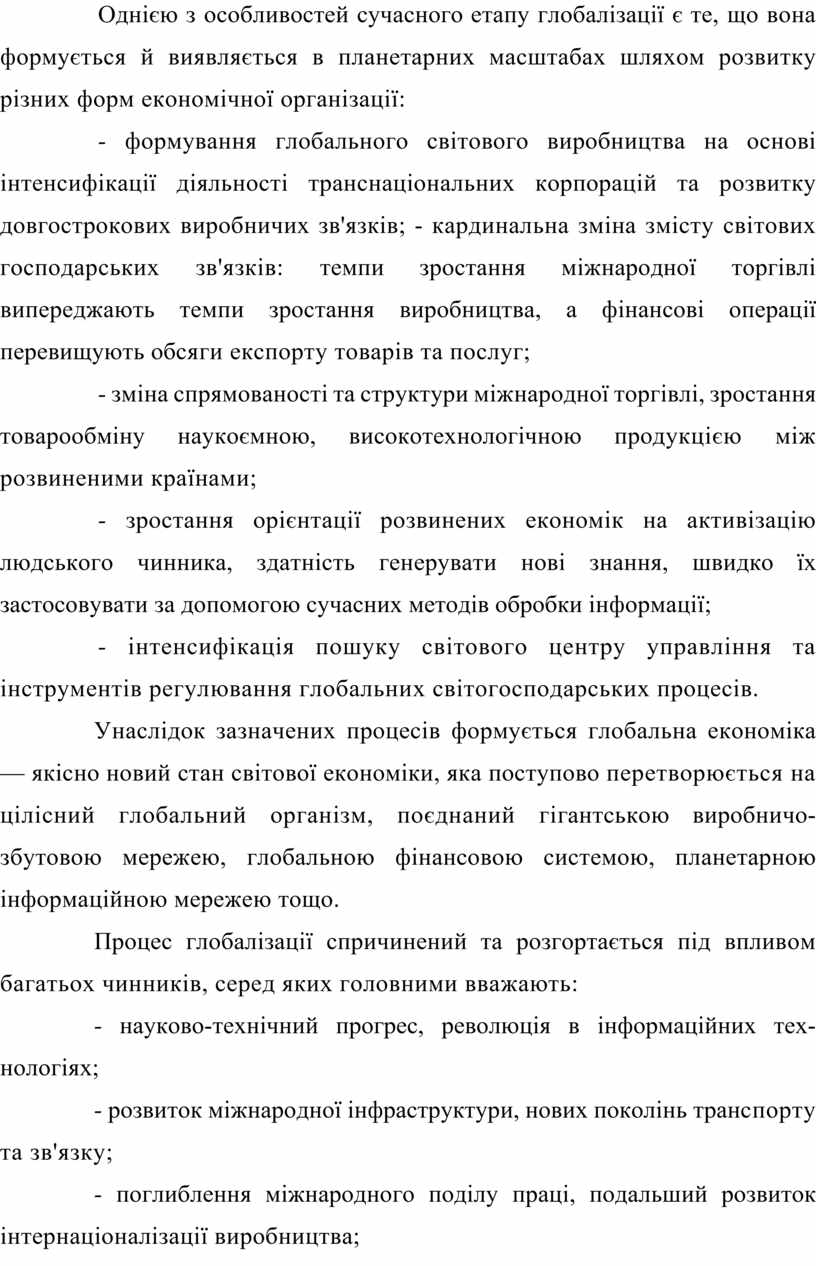 - формування глобального світового виробництва на основі інтенсифікації діяльності транснаціональних корпорацій та розвитку довгострокових виробничих зв'язків; - кардинальна зміна змісту світових господарських зв'язків: темпи зростання міжнародної торгівлі випереджають темпи зростання виробництва, а фінансові операції перевищують обсяги експорту товарів та послуг;