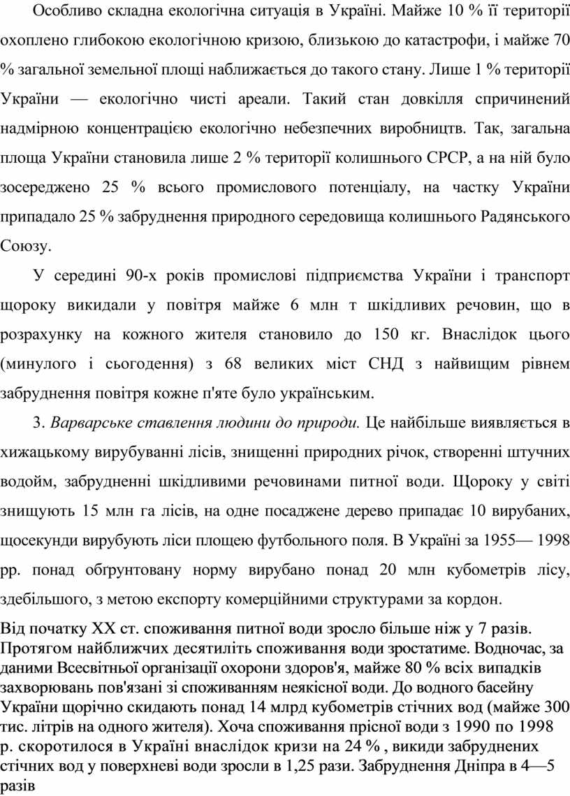 3. Варварське ставлення людини до природи. Це найбільше виявляється в хижацькому вирубуванні лісів, знищенні природних річок, створенні штучних водойм, забрудненні шкідливими речовинами питної води. Щороку у світі знищують 15 млн га лісів, на одне посаджене дерево припадає 10 вирубаних, щосекунди вирубують ліси площею футбольного поля. В Україні за 1955— 1998 pp. понад обґрунтовану норму вирубано понад 20 млн кубометрів лісу, здебільшого, з метою експорту комерційними структурами за кордон.