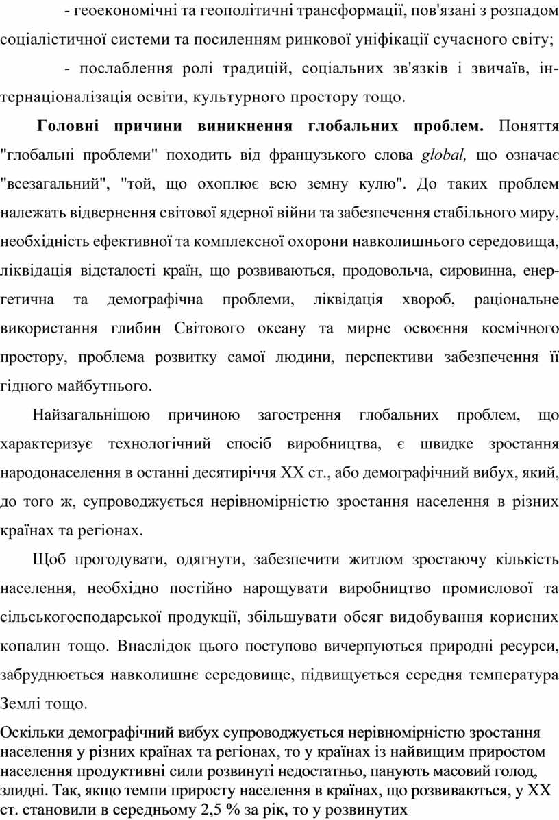 Головні причини виникнення глобальних проблем. Поняття "глобальні проблеми" походить від французького слова global, що означає "всезагальний", "той, що охоплює всю земну кулю". До таких проблем належать відвернення світової ядерної війни та забезпечення стабільного миру, необхідність ефективної та комплексної охорони навколишнього середовища, ліквідація відсталості країн, що розвиваються, продовольча, сировинна, енергетична та демографічна проблеми, ліквідація хвороб, раціональне використання глибин Світового океану та мирне освоєння космічного простору, проблема розвитку самої людини, перспективи забезпечення її гідного майбутнього.