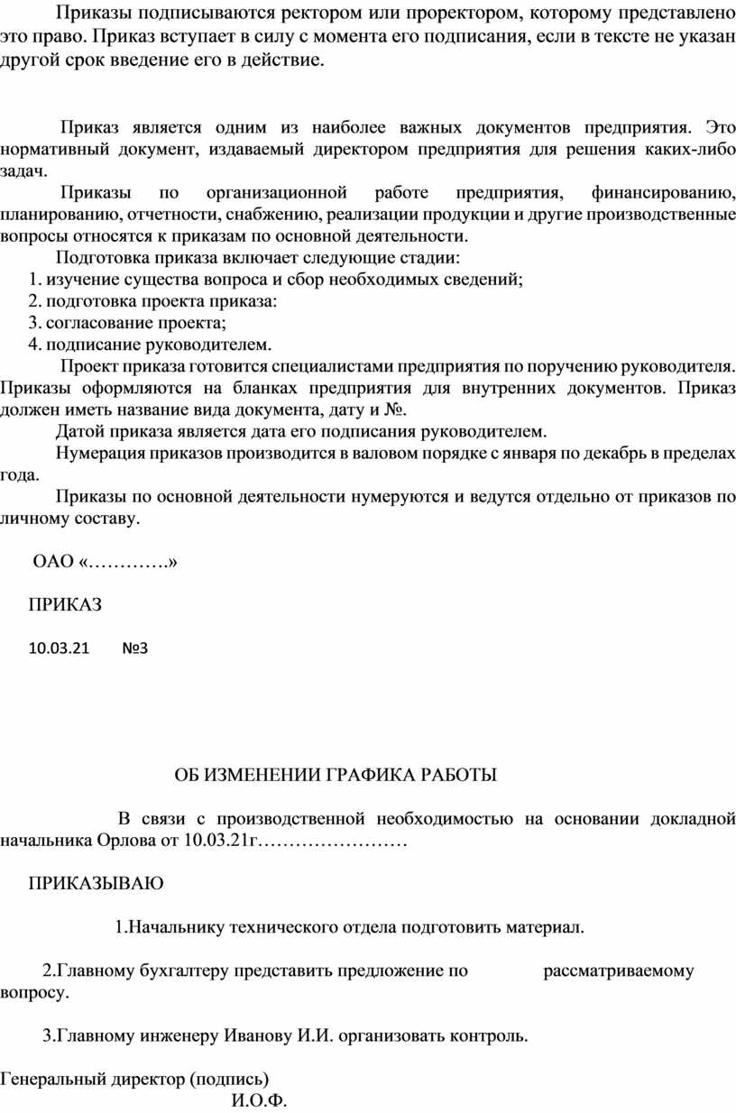 Проект приказа готовится специалистами предприятия по поручению руководителя. Приказы оформляются на бланках предприятия для внутренних документов. Приказ должен иметь название вида документа, дату и №.