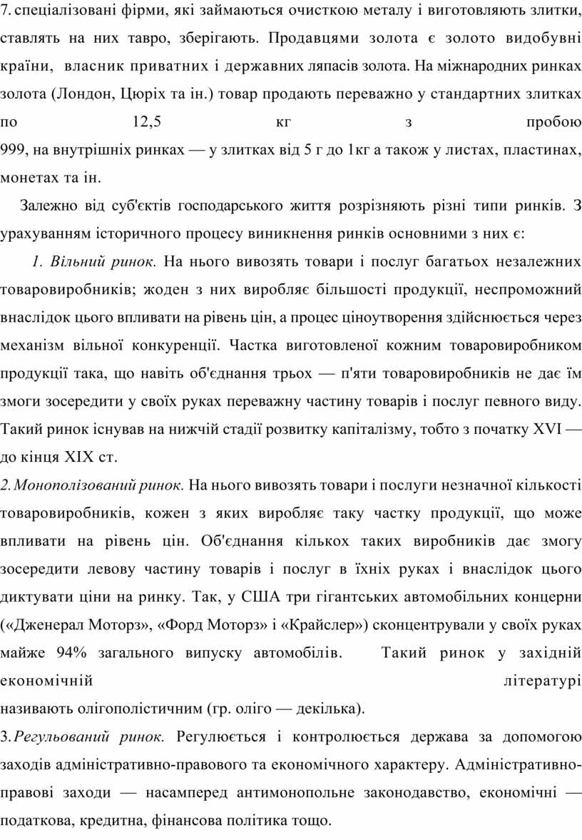 1. Вільний ринок. На нього вивозять товари і послуг багатьох незалежних товаровиробників; жоден з них виробляє більшості продукції, неспроможний внаслідок цього впливати на рівень цін, а процес ціноутворення здійснюється через механізм вільної конкуренції. Частка виготовленої кожним товаровиробником продукції така, що навіть об'єднання трьох — п'яти товаровиробників не дає їм змоги зосередити у своїх руках переважну частину товарів і послуг певного виду. Такий ринок існував на нижчій стадії розвитку капіталізму, тобто з початку XVI — до кінця XIX ст.