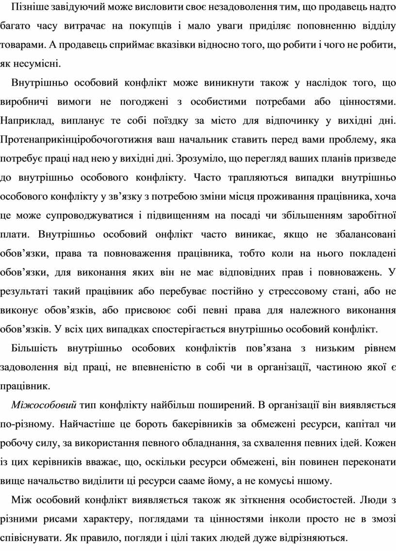 Внутрішньоособовий тип конфлікту дещо не відповідає визначенню, яке було зроблено нами раніше. Однак його потенційні дисфункціональні наслідки аналогічні наслідкам інших типів конфліктів. Він може виявитися в різних формах. Одна з найпоширеніших форм – рольовий конфлікт, коли до однієї людини ставлять суперечливі вимоги з приводу того, який повинен бути результат її праці. Наприклад, завідуючий відділом чи секцією універмагу може вимагати, щоб продавець постійно знаходився у відділі і надавав покупцям інформацію та послуги. Пізніше завідуючий може висловити своє незадоволення тим, що продавець надто багато часу витрачає на покупців і мало уваги приділяє поповненню відділу товарами. А продавець сприймає вказівки відносно того, що робити і чого не робити, як несумісні.