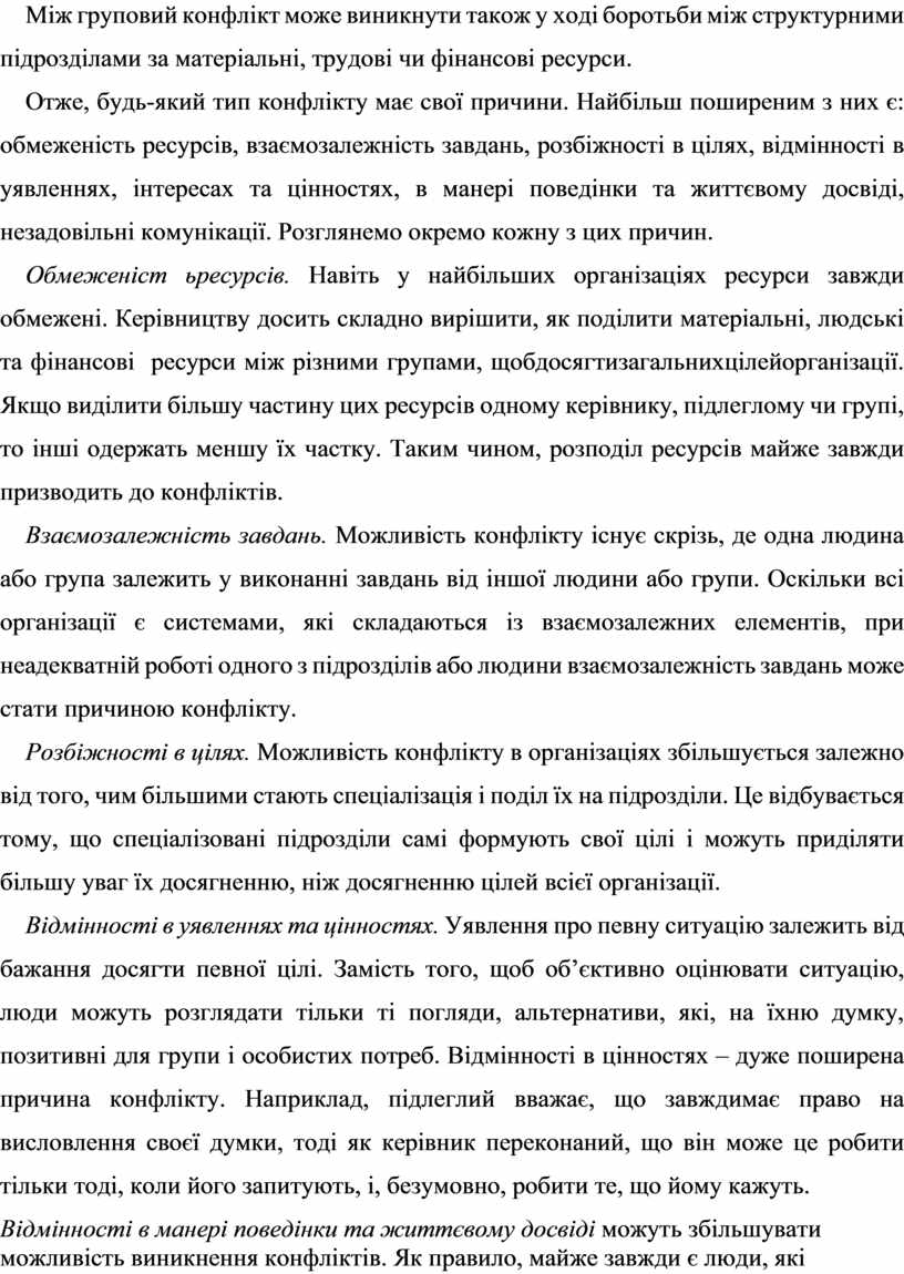 Отже, будь-який тип конфлікту має свої причини. Найбільш поширеним з них є: обмеженість ресурсів, взаємозалежність завдань, розбіжності в цілях, відмінності в уявленнях, інтересах та цінностях, в манері поведінки та життєвому досвіді, незадовільні комунікації. Розглянемо окремо кожну з цих причин.