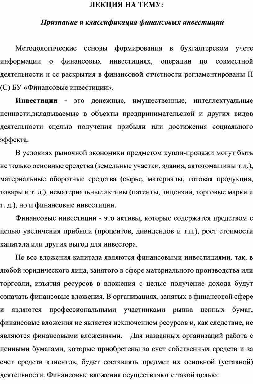 Не все вложения капитала являются финансовыми инвестициями. так, в любой юридического лица, занятого в сфере материального производства или торговли, изъятия ресурсов в вложения с целью получение дохода будут означать финансовые вложения. В организациях, занятых в финансовой сфере и являются профессиональными участниками рынка ценных бумаг, финансовые вложения не является исключением ресурсов и, как следствие, не являются финансовыми вложениями. Для названных организаций работа с ценными бумагами, которые приобретены за счет собственных средств и за счет средств клиентов, будет составлять предмет их основной (уставной) деятельности. Финансовые вложения осуществляют с такой целью: