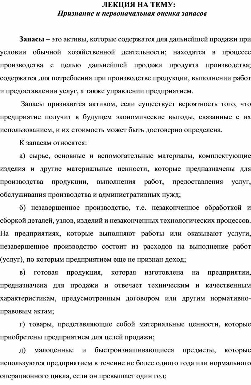 Запасы – это активы, которые содержатся для дальнейшей продажи при условии обычной хозяйственной деятельности; находятся в процессе производства с целью дальнейшей продажи продукта производства; содержатся для потребления при производстве продукции, выполнении работ и предоставлении услуг, а также управлении предприятием.