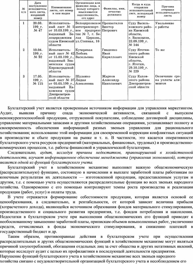 В процессе проведения комплексных ревизий финансово-хозяйственной деятельности предприятий объектом контроля является также достоверность и своевременность учета исполнительных листов и других документов (решений арбитража) на возмещение причиненного ущерба.