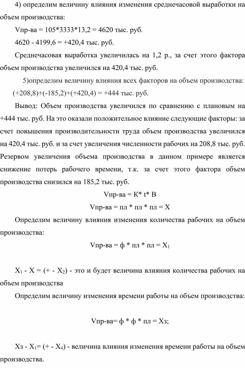 Вывод: Объем производства увеличился по сравнению с плановым на +444 тыс. руб. На это оказали положительное влияние следующие факторы: за счет повышения производительности труда объем производства увеличился на 420,4 тыс. руб. и за счет увеличения численности рабочих на 208,8 тыс. руб. Резервом увеличения объема производства в данном примере является снижение потерь рабочего времени, т.к. за счет этого фактора объем производства снизился на 185,2 тыс. руб.