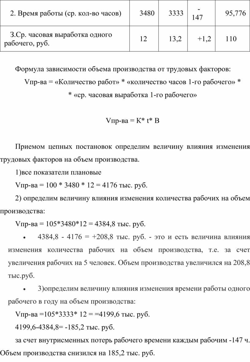 за счет внутрисменных потерь рабочего времени каждым рабочим -147 ч. Объем производства снизился на 185,2 тыс. руб.