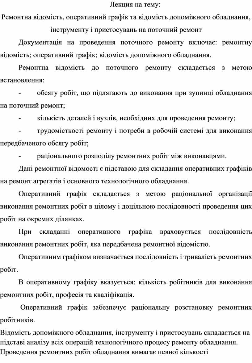 Ремонтна відомість, оперативний графік та відомість допоміжного обладнання, інструменту і пристосувань на поточний ремонт