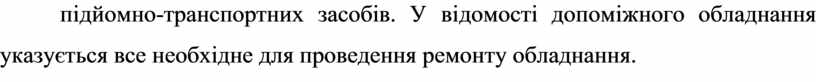 Відомість допоміжного обладнання, інструменту і пристосувань складається на підставі аналізу всіх операцій технологічного процесу ремонту обладнання. Проведення ремонтних робіт обладнання вимагає певної кількості підйомно-транспортних засобів. У відомості допоміжного обладнання указується все необхідне для проведення ремонту обладнання.