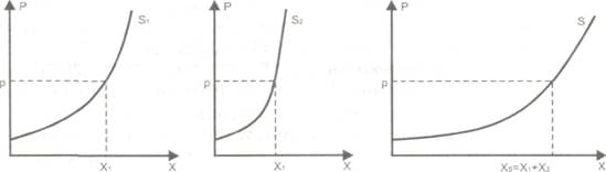 Крива ринкової пропозиції (S) складається з кривих індивідуальних пропозицій і будується аналогічно кривій ринкового попиту (D) (рис. 4).