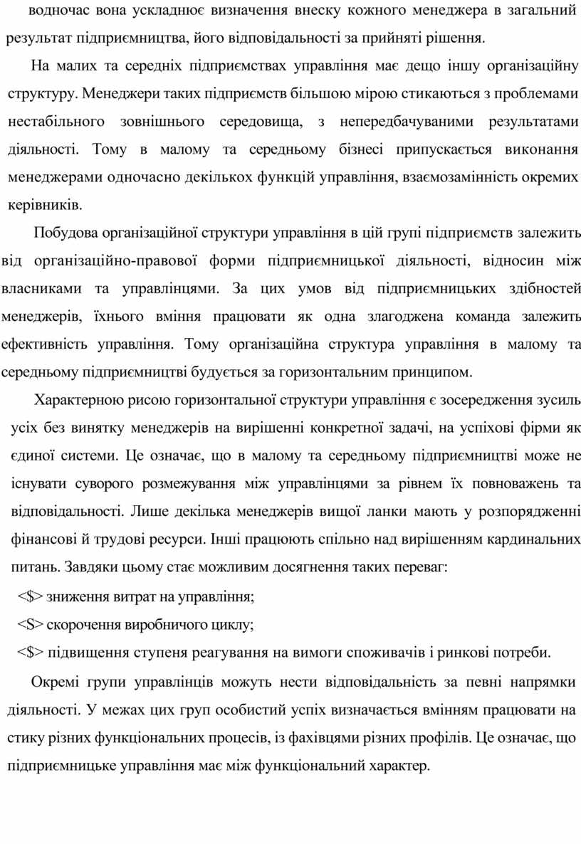 На малих та середніх підприємствах управління має дещо іншу організаційну структуру. Менеджери таких підприємств більшою мірою стикаються з проблемами нестабільного зовнішнього середовища, з непередбачуваними результатами діяльності. Тому в малому та середньому бізнесі припускається виконання менеджерами одночасно декількох функцій управління, взаємозамінність окремих керівників.