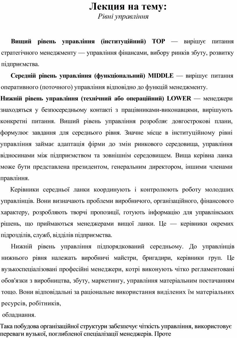 Вищий рівень управління (інституційний) ТОР — вирішує питання стратегічного менеджменту — управління фінансами, вибору ринків збуту, розвитку підприємства.