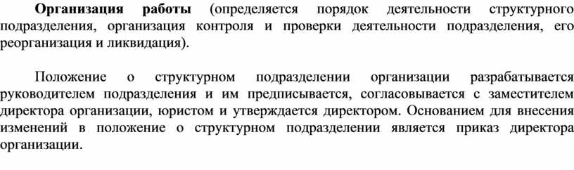 Организация работы (определяется порядок деятельности структурного подразделения, организация контроля и проверки деятельности подразделения, его реорганизация и ликвидация).