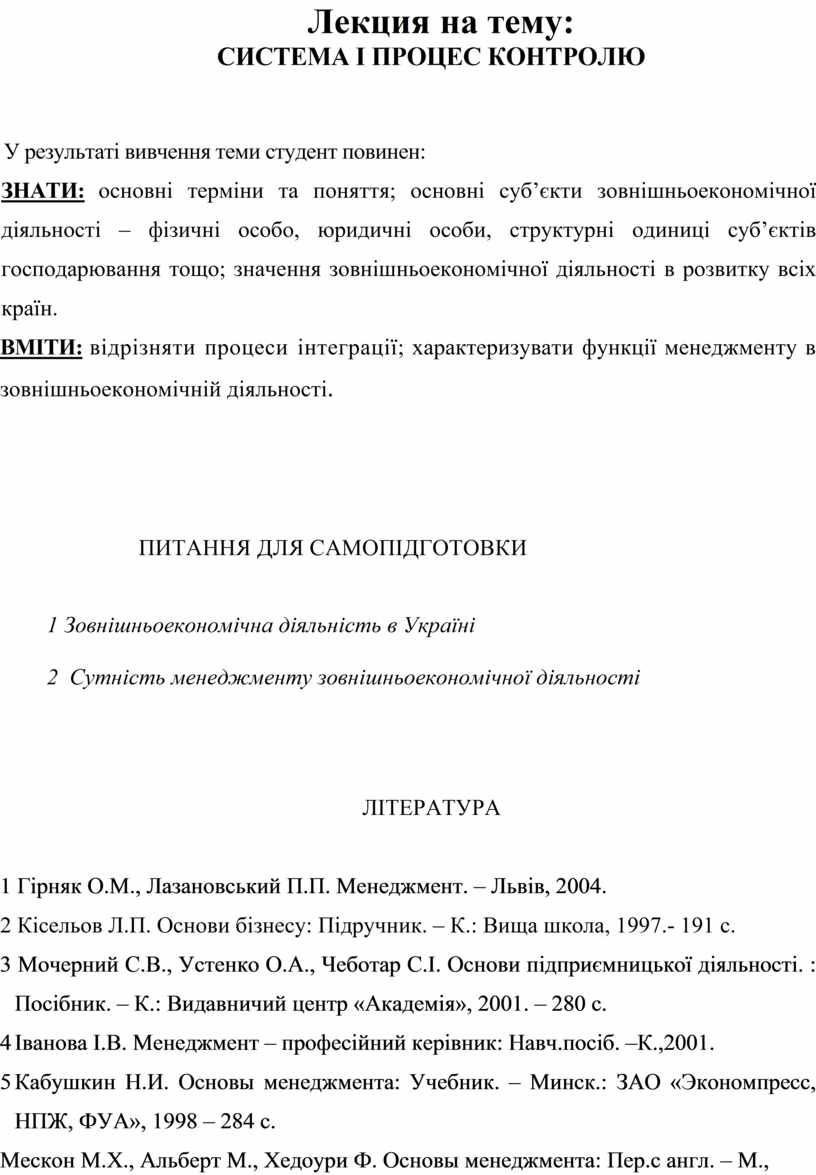 ВМІТИ: відрізняти процеси інтеграції; характеризувати функції менеджменту в зовнішньоекономічній діяльності.