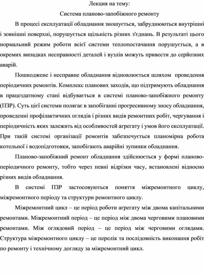 Планово-запобіжний ремонт обладнання здійснюється у формі планово-періодичного ремонту, тобто через певні відрізки часу, встановлені відносно різних видів обладнання.
