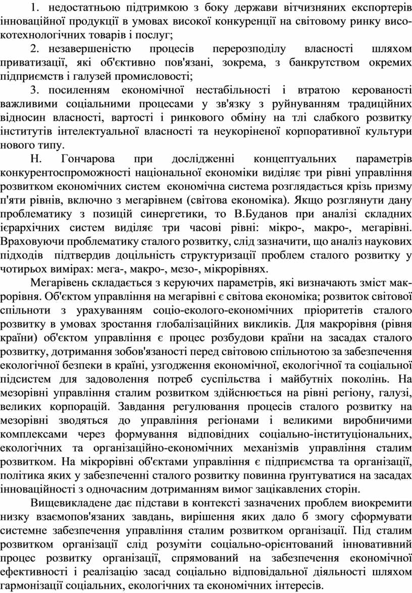 21. Розв'язання проблем забезпечення сталого розвитку економіки значною мірою пов'язане з необхідністю комплексного вирішення завдань сталого розвитку на всіх рівнях економічної системи. При цьому важливим є структу- ризація проблем сталого розвитку на мега-, макро-, мезо-, мікрорівнях на системній основі.