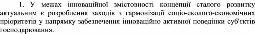 23. У межах інноваційної змістовності концепції сталого розвитку актуальним є розроблення заходів з гармонізації соціо-еколого-економічних пріоритетів у напрямку забезпечення інноваційно активної поведінки суб'єктів господарювання.