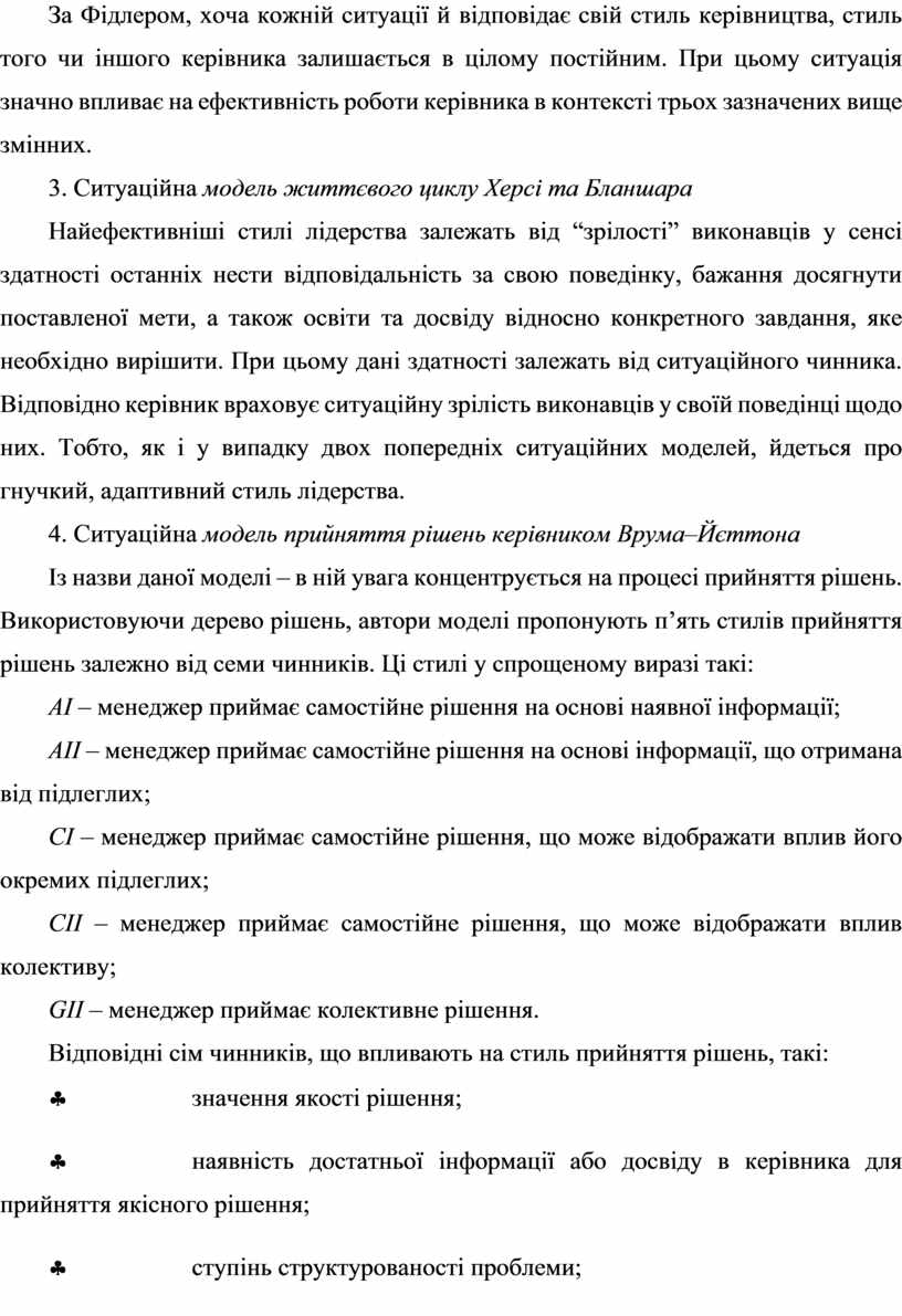 При цьому головними ситуаційними чинниками при виборі стилю керівництва є особистісні якості підлеглих і вимоги та впливи з боку зовнішнього середовища.