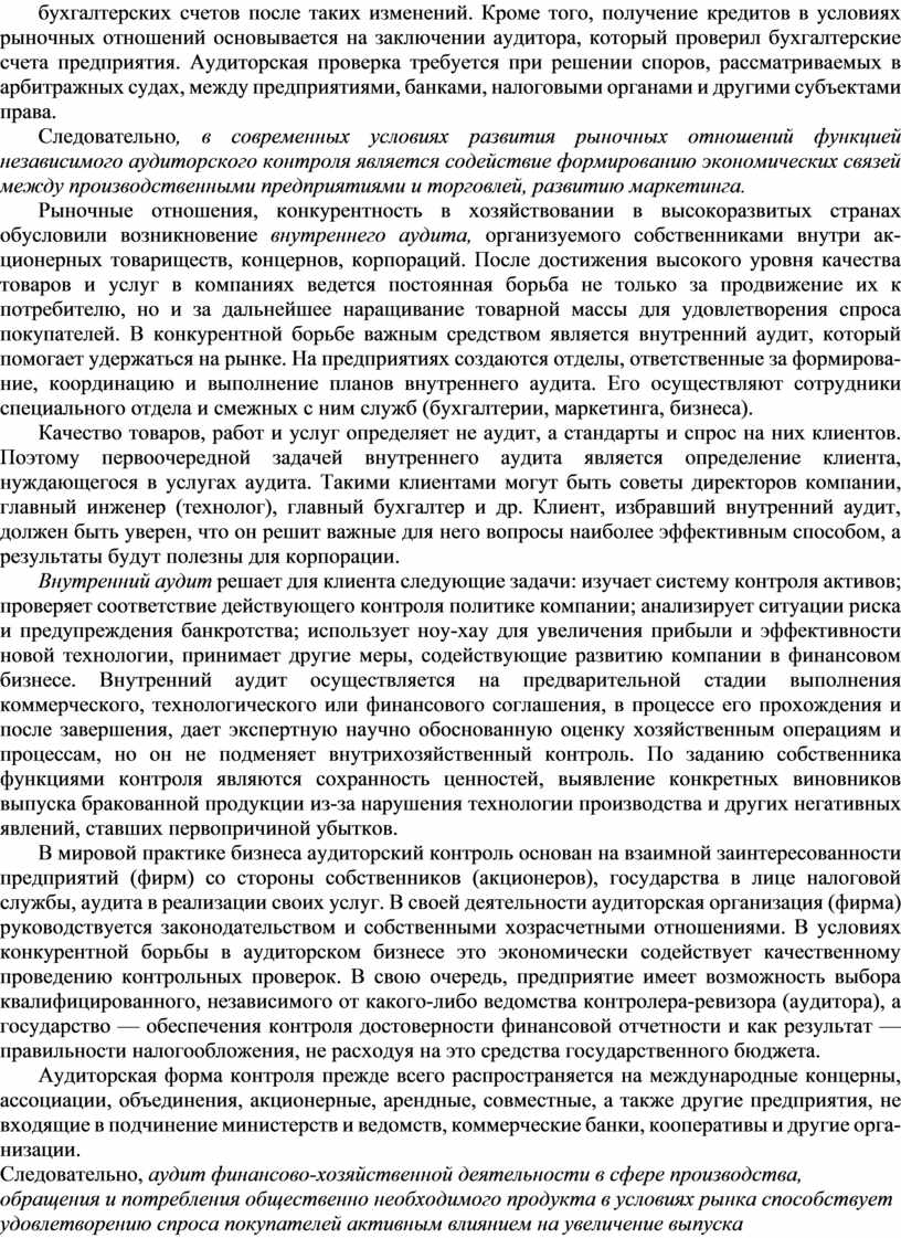Следовательно, аудит финансово-хозяйственной деятельности в сфере производства, обращения и потребления общественно необходимого продукта в условиях рынка способствует удовлетворению спроса покупателей активным влиянием на увеличение выпуска конкурентоспособных товаров, росту прибыли предприятий и через систему налогов повышению отчислений в государственный бюджет.