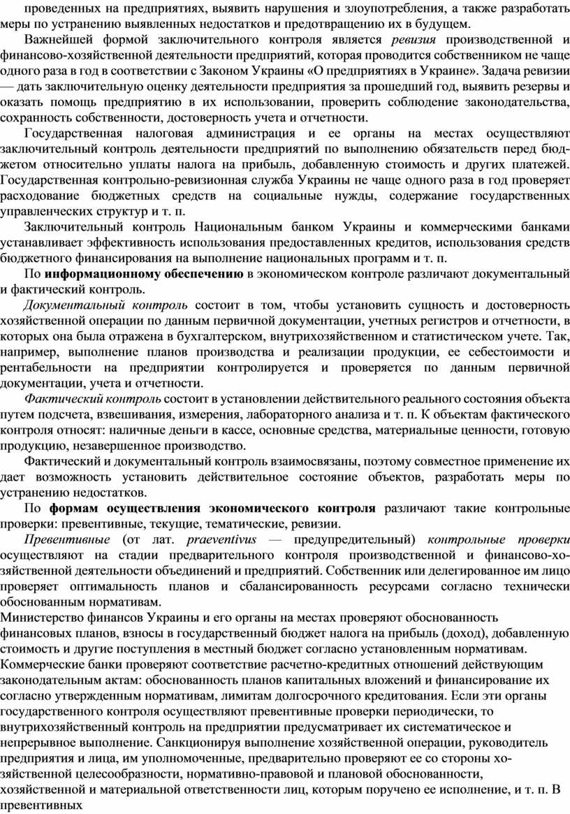 Важнейшей формой заключительного контроля является ревизия производственной и финансово-хозяйственной деятельности предприятий, которая проводится собственником не чаще одного раза в год в соответствии с Законом Украины «О предприятиях в Украине». Задача ревизии — дать заключительную оценку деятельности предприятия за прошедший год, выявить резервы и оказать помощь предприятию в их использовании, проверить соблюдение законодательства, сохранность собственности, достоверность учета и отчетности.