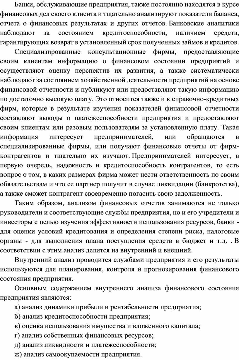 Анализ финансовой отчетности должен дать ответ на два вопроса: первый - имеет ли предприятие прибыль по результатам своей хозяйственной деятельности и второе - или способно предприятие выполнить взятые на себя обязательства и не приведет такое исполнение до его ликвидации в связи с недостаточностью ресурсов .