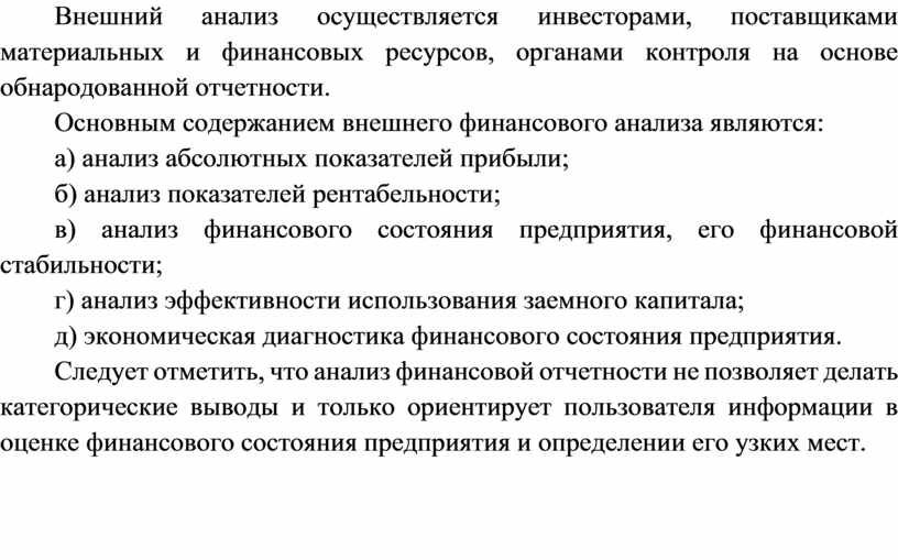 Внешний анализ осуществляется инвесторами, поставщиками материальных и финансовых ресурсов, органами контроля на основе обнародованной отчетности.