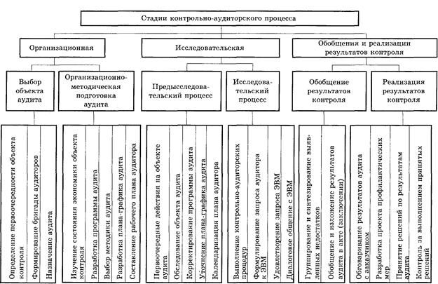 Финансово-хозяйственный контроль и аудит во всех звеньях народного хозяйства, прежде всего в его основном звене — предприятии, осуществляется путем проведения ревизий тематических, выборочных, сплошных, аудиторских и других контрольных проверок с помощью определенных приемов. Совокупность организационных, методических и технических приемов, осуществляемых с помощью определенных процедур, составляет контрольно-аудиторский процесс. Всякий динамический процесс, связанный с использованием средств и предметов труда, а также самого труда, состоит из организационной, технологической и завершающей стадий. Для контрольно-аудиторского процесса такими стадиями являются: организационная, исследовательская, обобщения и реализации результатов контроля. Организовывают и непосредственно осуществляют этот процесс контрольно-аудиторские подразделения, имеющиеся в структуре органов управления, на которые возложены контрольные функции на предприятиях. Независимый финансово-хозяйственный контроль проводится аудиторскими фирмами.