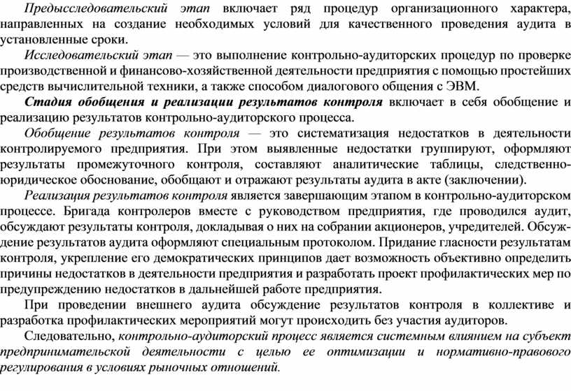 Исследовательский этап — это выполнение контрольно-аудиторских процедур по проверке производственной и финансово-хозяйственной деятельности предприятия с помощью простейших средств вычислительной техники, а также способом диалогового общения с ЭВМ.