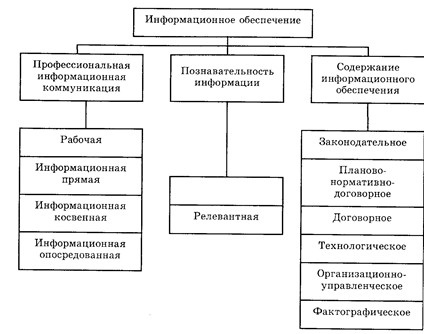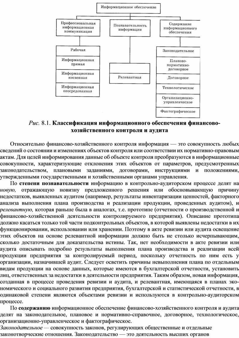 Исходя из задач информационного обеспечения и роли в контрольно-аудиторском процессе в основу его классификации положена профессиональная информационная коммуникация, познавательность информации и содержание информационного обеспечения (рис. 8.1).