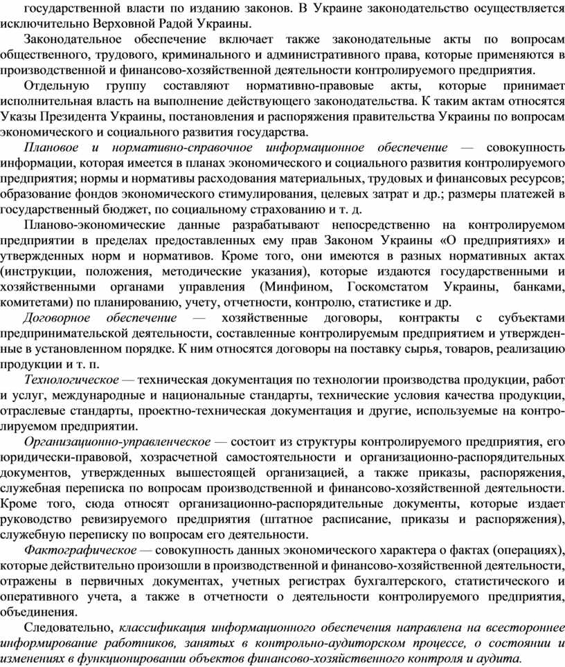 По содержанию информационное обеспечение финансово-хозяйственного контроля и аудита делят на законодательное, плановое и нормативно-справочное, договорное, технологическое, организационно-управленческое и фактографическое.