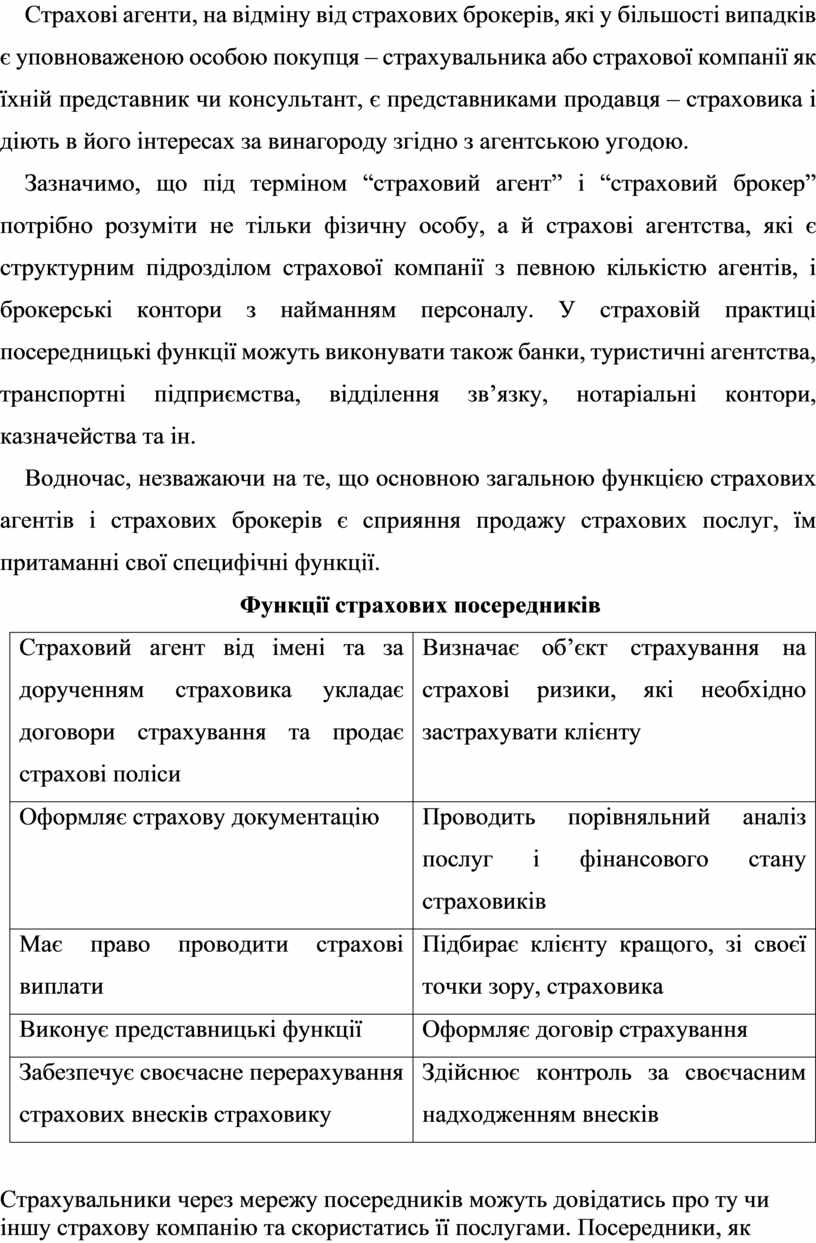 Зазначимо, що під терміном “страховий агент” і “страховий брокер” потрібно розуміти не тільки фізичну особу, а й страхові агентства, які є структурним підрозділом страхової компанії з певною кількістю агентів, і брокерські контори з найманням персоналу. У страховій практиці посередницькі функції можуть виконувати також банки, туристичні агентства, транспортні підприємства, відділення зв’язку, нотаріальні контори, казначейства та ін.