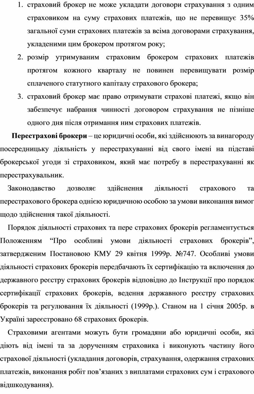 Порядок діяльності страхових та пере страхових брокерів регламентується Положенням “Про особливі умови діяльності страхових брокерів”, затвердженим Постановою КМУ 29 квітня 1999р. №747. Особливі умови діяльності страхових брокерів передбачають їх сертифікацію та включення до державного реєстру страхових брокерів відповідно до Інструкції про порядок сертифікації страхових брокерів, ведення державного реєстру страхових брокерів та регулювання їх діяльності (1999р.). Станом на 1 січня 2005р. в Україні зареєстровано 68 страхових брокерів.