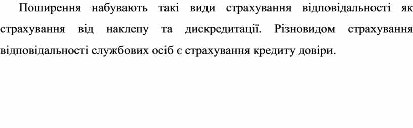 Поширення набувають такі види страхування відповідальності як страхування від наклепу та дискредитації. Різновидом страхування відповідальності службових осіб є страхування кредиту довіри.