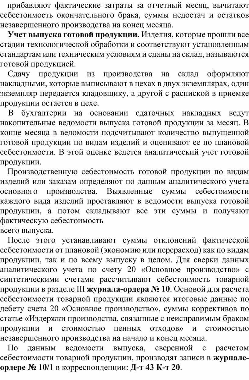 После этого устанавливают суммы отклонений фактической себестоимости от плановой (экономию или перерасход) как по видам продукции, так и по всему выпуску в целом. Для сверки данных аналитического учета по счету 20 «Основное производство» с синтетическими счетами рассчитывают себестоимость товарной продукции в разделе III журнала-ордера № 10. Основой для расчета себестоимости товарной продукции являются итоговые данные по дебету счета 20 «Основное производство», суммы коррективов по статье «Издержки производства, связанные с неисправимым браком продукции и стоимостью ценных отходов» и стоимостью незавершенного производства на начало и конец месяца.