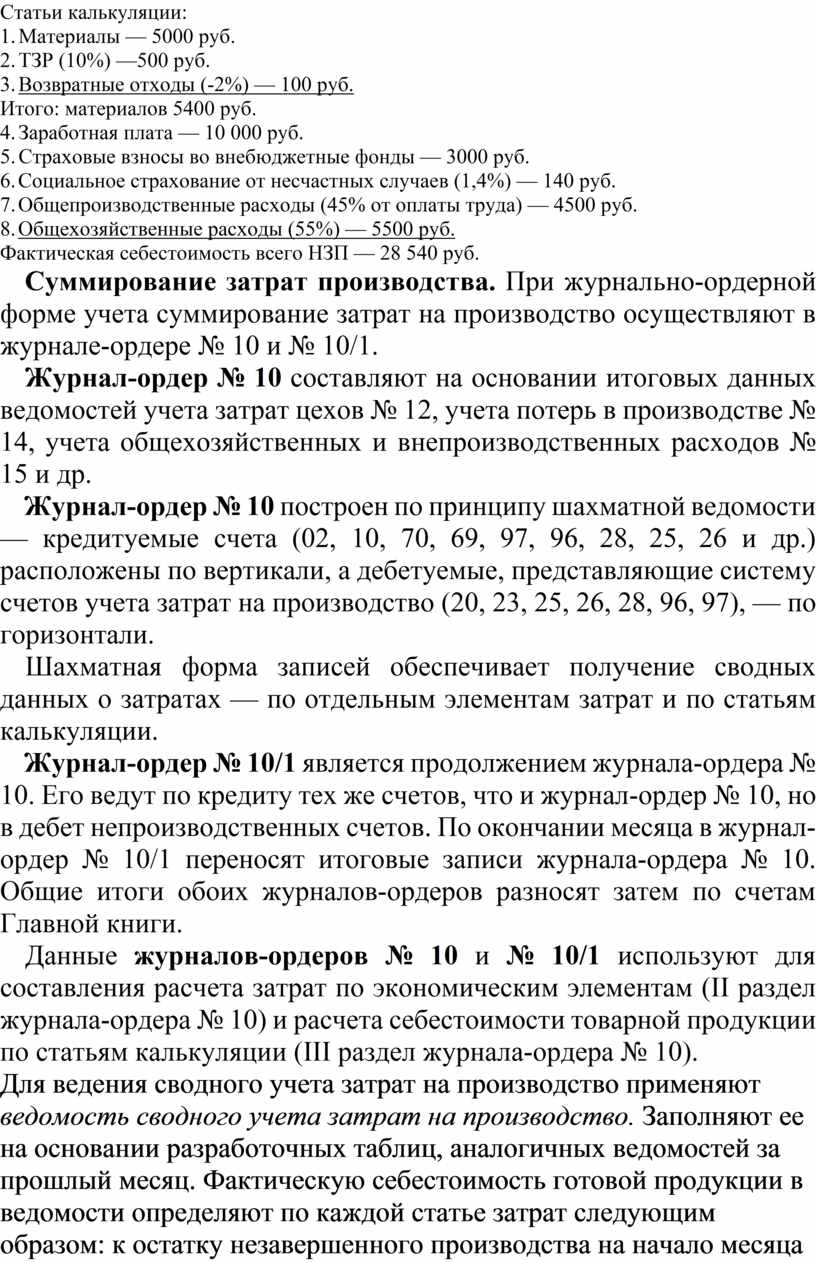 Суммирование затрат производства. При журнально-ордерной форме учета суммирование затрат на производство осуществляют в журнале-ордере № 10 и № 10/1.
