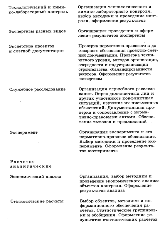 Аналитические — расчленение объекта контроля на составные элементы и исследование их с применением специальных методик. Так анализируют выполнение государственного заказа по выпуску важнейших видов продукции в ассортименте; проводят технологический и химико-лабораторный контроль качества изделий и т. п.