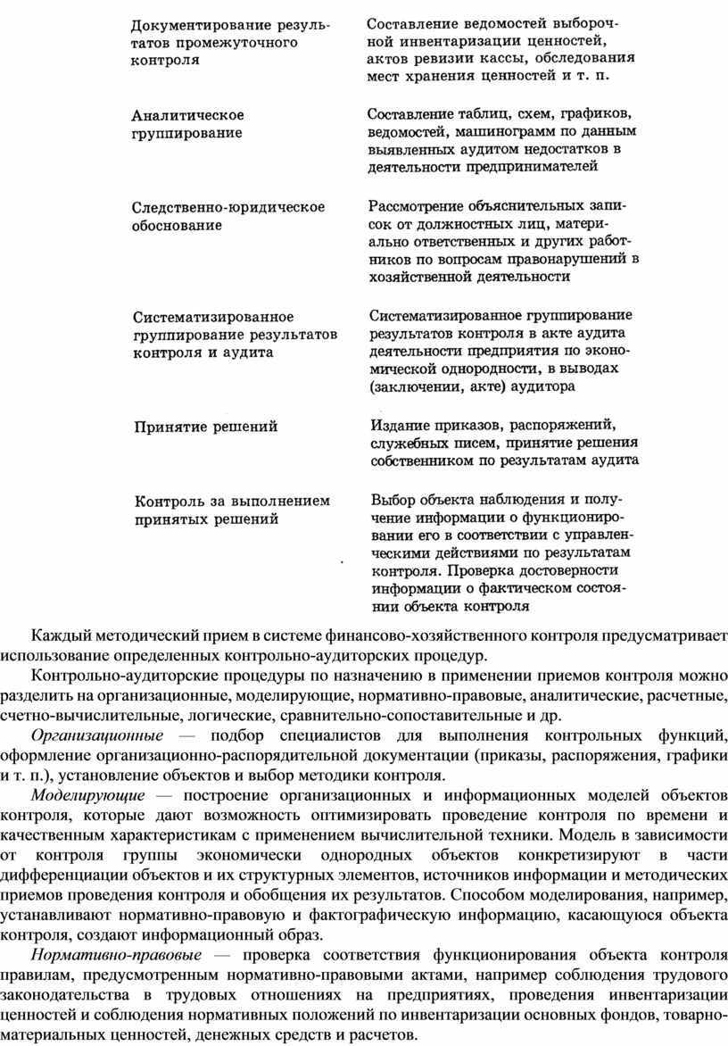 Контроль выполняет свои функции с помощью собственного метода, который является системой методических приемов и конкретных методик. Реализация любого метода управления, в том числе и финансово-хозяйственного контроля и аудита, осуществляется с помощью определенных процедур.