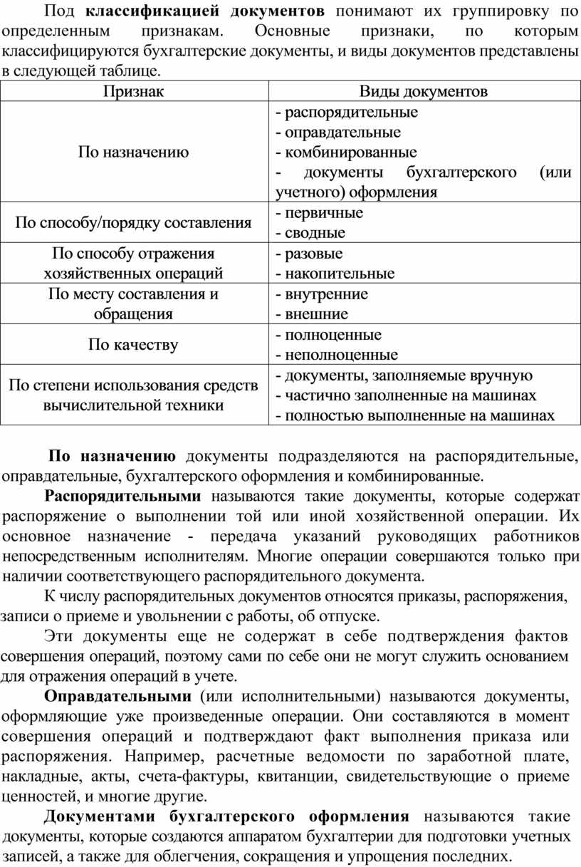 Под классификацией документов понимают их группировку по определенным признакам. Основные признаки, по которым классифицируются бухгалтерские документы, и виды документов представлены в следующей таблице.
